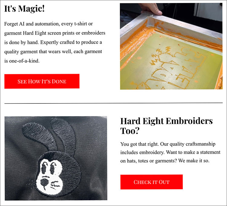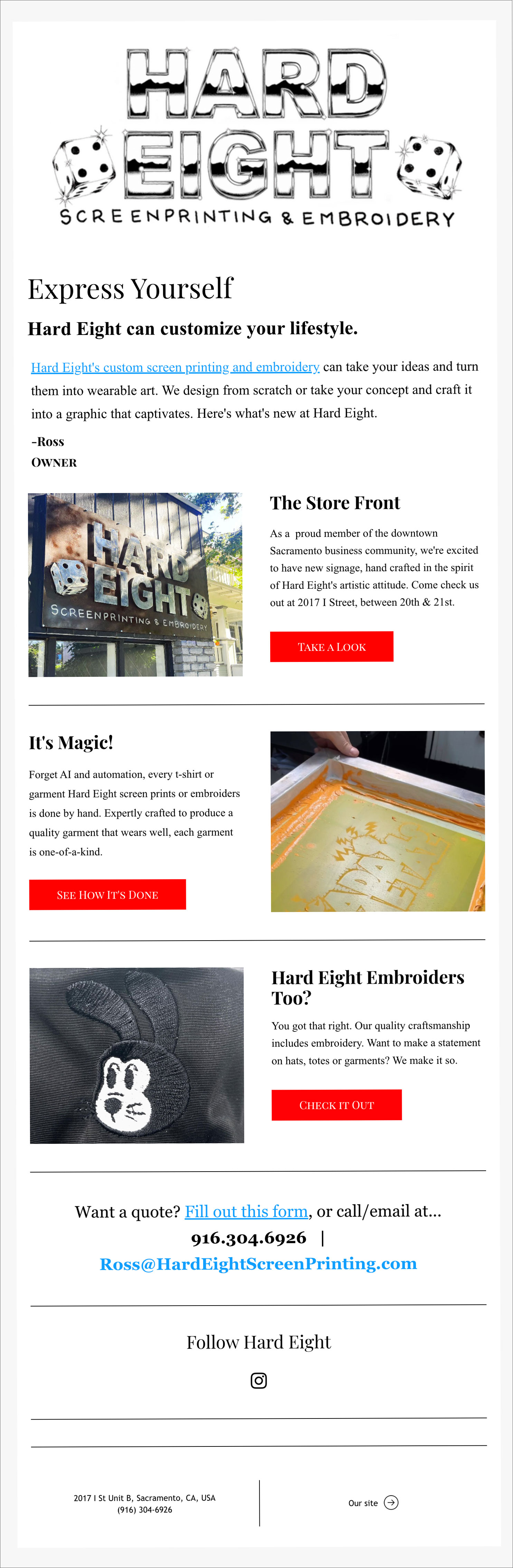 Ross Curry, owner of Hard Eight Screen Printing, had saturated his existing target market and wanted to expand his audience to increase sales. He collaborated with Suzanne to build an email campaign that would open up a new market for his custom screen-printing and embroidery services. Leveraging Hard Eight’s CRM Wix, Suzanne built a campaign for Hard Eight targeting the new audience and a retargeting campaign for Ross’ existing database.