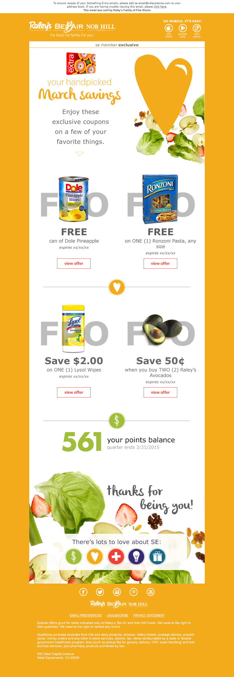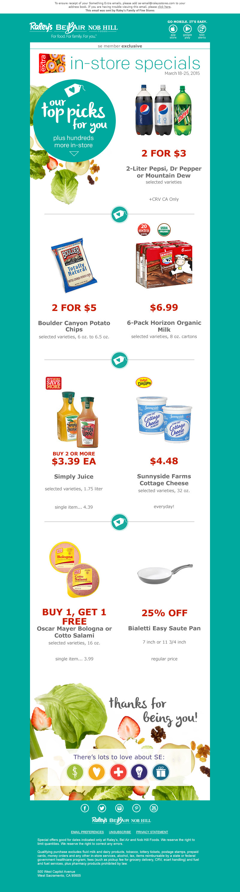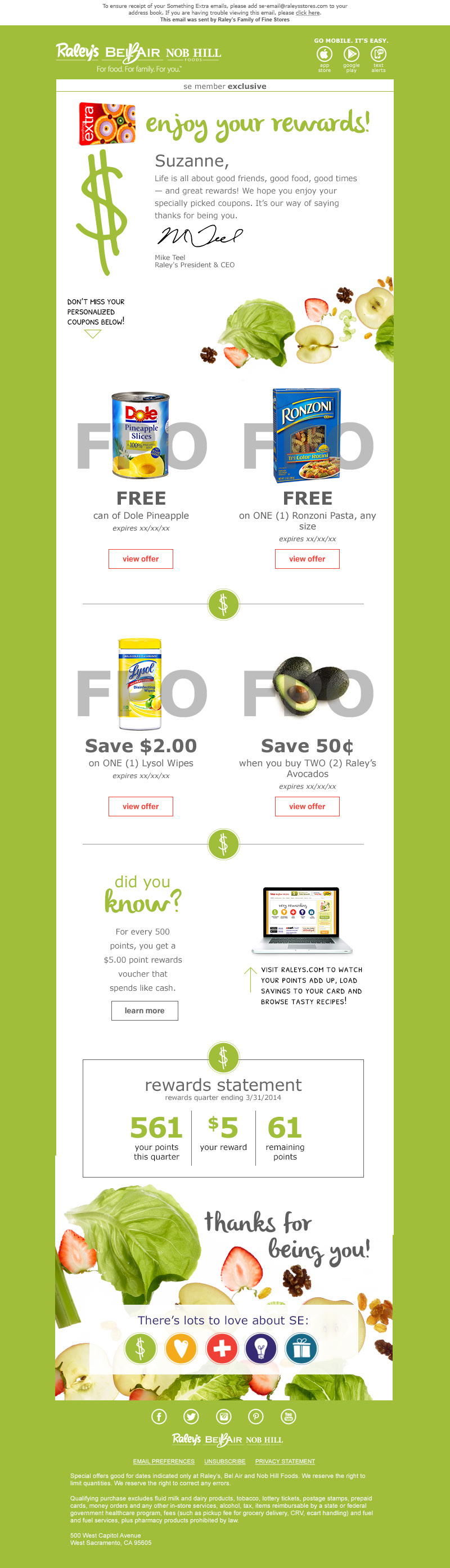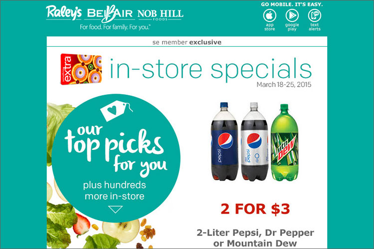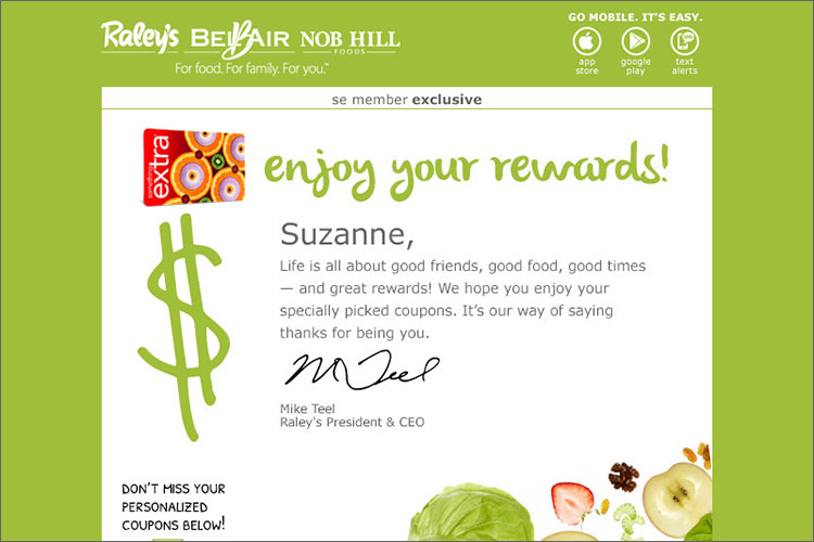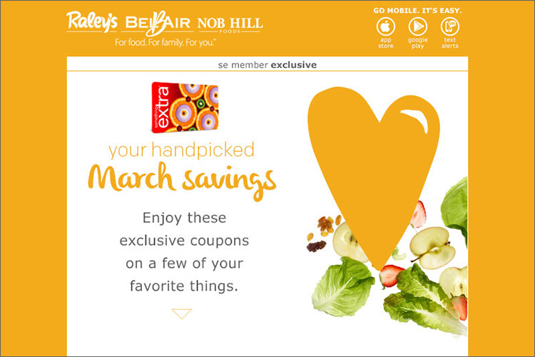As CRM Marketing Manager for Raley’s 122 grocery stores in Northern California and Nevada, Suzanne strategized and executed email marketing campaigns in the Salesforce marketing Cloud. Targeting members of Raley’s loyalty program, Something Extra, the campaigns offered incentive and rewards to customers based on their shopping behavior. Offering promotions to loyal customers while developing a digital relationship with new customers, Suzanne created email campaigns created to drive sales.